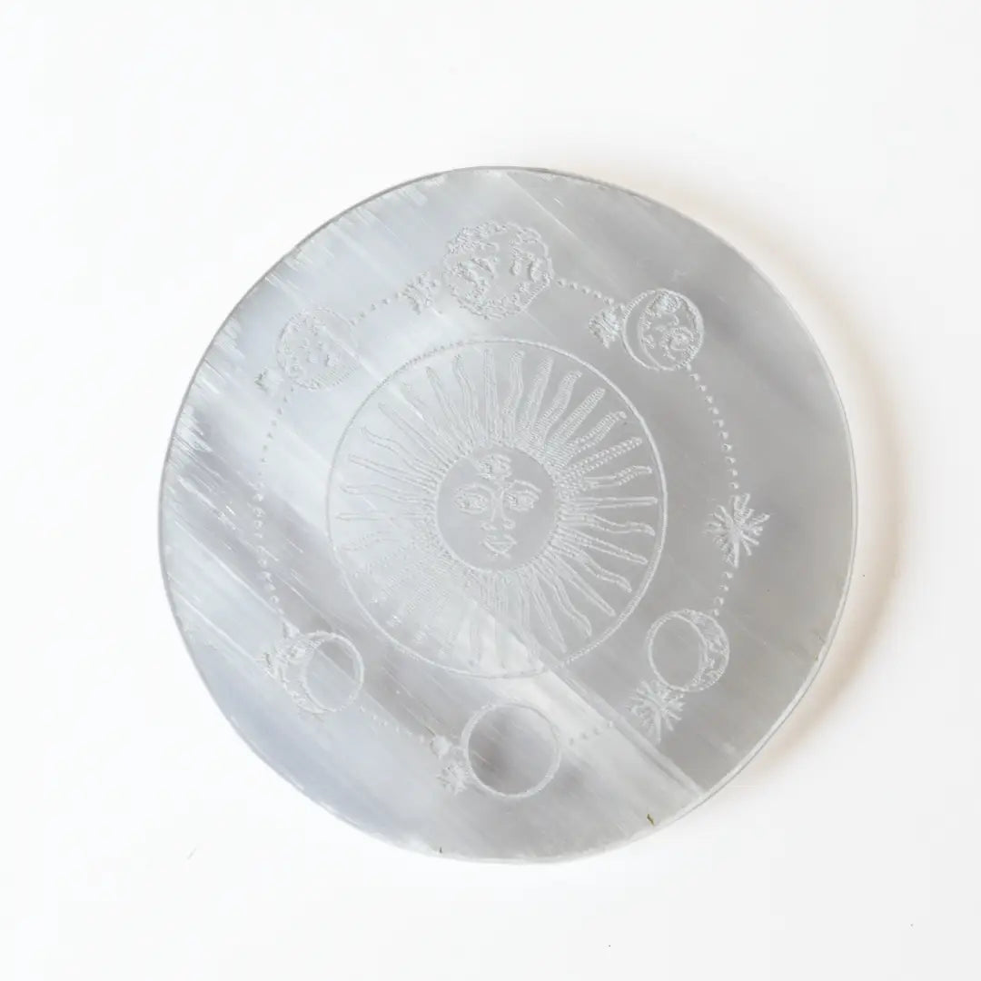 This mesmerizing Selenite Solar System Charging Plate features an intricately engraved sun and planetary design, symbolizing cosmic harmony and universal energy balance. Made from pure selenite, it serves as a natural energy cleanser and amplifier, perfect for recharging crystals, jewelry, and spiritual tools. The celestial pattern enhances alignment with higher vibrations, making it ideal for meditation, manifestation, and astrological practices.