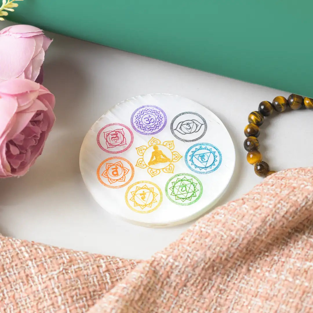 This is a round plate crafted from Selenite crystal, known for its white, fibrous texture and high-vibrational, purifying energy. The plate features a colorful engraving of the Seven Main Chakra Symbols (Root, Sacral, Solar Plexus, Heart, Throat, Third Eye, and Crown). In one design, the symbols surround a meditating figure; in the other, they are arranged in a circle around the figure's central energy field. This tool powerfully merges Selenite's cleansing abilities with the Chakra system to promote energetic balance and spiritual clarity.