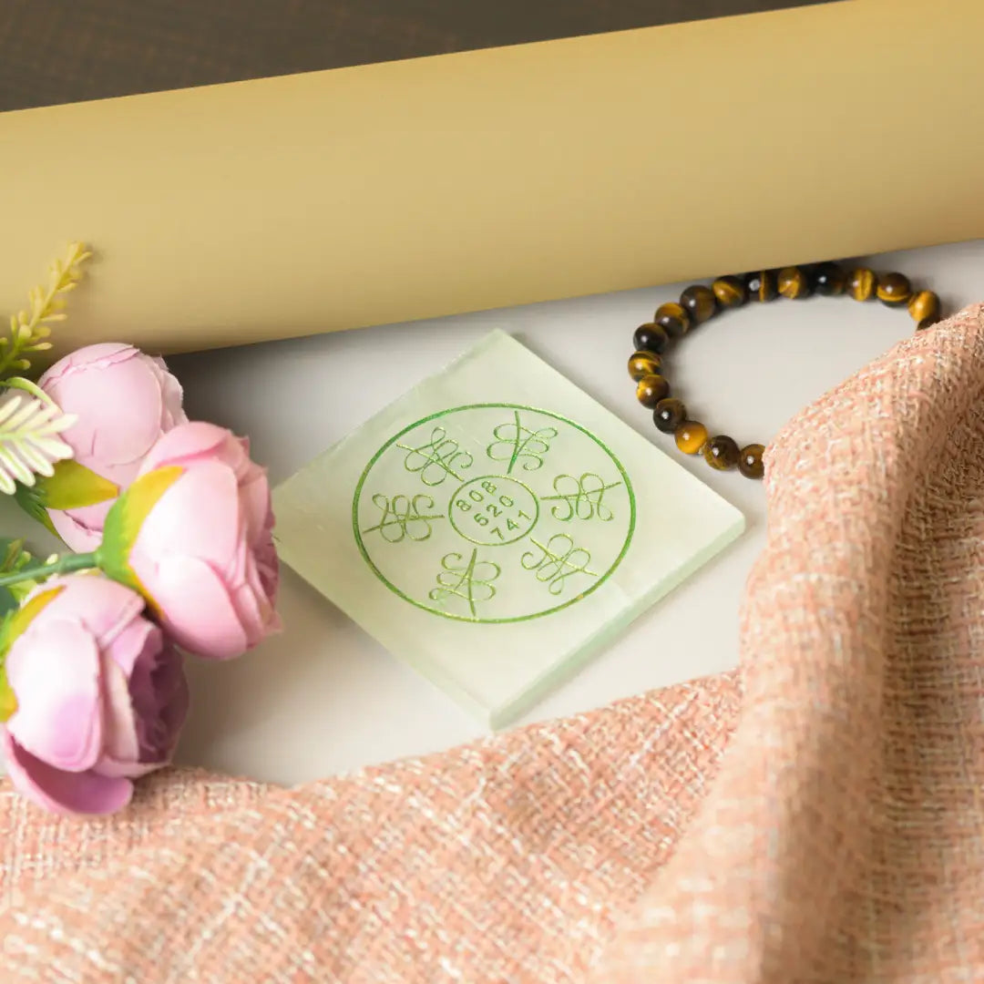 This is a square plate crafted from Selenite crystal, known for its pure white color and powerful cleansing energy. It features a circular design, typically in green, containing six repeating geometric sigils and three numerical sequences in the center: 808, 520, and 741. This powerful spiritual tool merges Selenite's ability to amplify energy with these specific symbols and numbers. It is primarily used to strengthen intentions, attract abundance, and focus energy for manifestation and healing purposes.